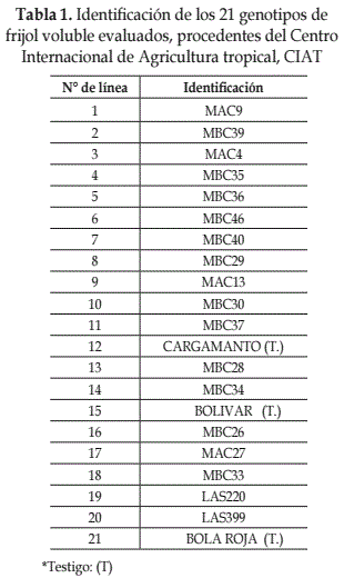 Para la evaluación de los 21 genotipos de frijol voluble se utilizó un diseño de bloques al azar con tres repeticiones. La unidad experimental estuvo representada por una parcela de tres surcos de 3 m de largo cada uno, separados 1,5 m, utilizando como testigos las variedades comerciales Bola Roja, Bolivar y Cargamanto, para un total de 21 materiales. Con base en el análisis de suelos se aplicó cal antes de la siembra en dosis de 1000 kg/ha y siguiendo las recomendaciones de FENALCE en la etapa de prefloración se aplicó fertilizante 15-15-15, a razón de 80 kg/ha.