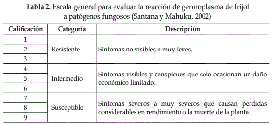 En la variable días a la floración (DAF) se determinó el número de días desde la siembra efectiva hasta que el 50 % de las plantas tuvieron la primera flor abierta y en días a madurez de cosecha (DAM), el número de días que transcurrieron desde la siembra hasta que el 90% de las vainas alcanzaron su madurez fisiológica. La adaptación vegetativa o vigor de crecimiento (VC) se determinó cuando la planta alcanzó su máximo desarrollo, teniendo en cuenta el efecto que ejerce el hábito de crecimiento en el vigor de la planta. Para el efecto se utilizó una escala de 1 (excelente) a 9 (muy pobre). La incidencia de enfermedades se registró entre las etapas de desarrollo de la planta de frijol R6 a R8 (floración a llenado de vainas) e incluyó evaluación de mancha angular Alternaria spp., antracnosis Colletotrichum lindemuthianum Sacc. Mag Scrib, roya Uromyces phaseoli y ascochita Aschochyta phaseolorum, Sacc tanto en el follaje (Etapa de plena floración) como en las vainas (Etapa del llenado), tomando en cuenta la escala general para evaluar germoplasma de frijol a patógenos fungosos, como aparece en la tabla 2.
