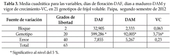 En la tabla 3 se presenta la media cuadrática y el nivel de significancia de las características días a floración (DAF), días a madurez (DAM) y vigor de crecimiento (VC) de los genotipos volubles evaluados. Los análisis de varianza, muestran diferencias significativas para las variables DAF, DAM y VC entre los genotipos.