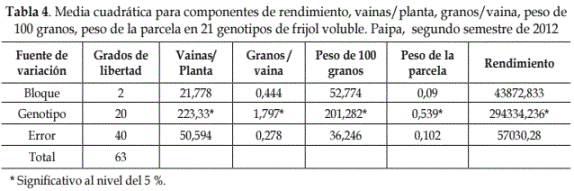 La tabla 4 muestra la media cuadrática y el nivel de significancia para las variables asociadas con el rendimiento y el rendimiento de los 21 genotipos. Según los valores de la tabla las diferencias entre genotipos fueron significativas para todas las variables evaluadas.