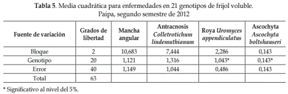 En la tabla 5 se observa la media cuadrática de los genotipos de frijol voluble para las variables correspondientes a presencia de enfermedades en donde se registran diferencias significativas entre genotipos para las enfermedades Roya y Ascochyta sp.