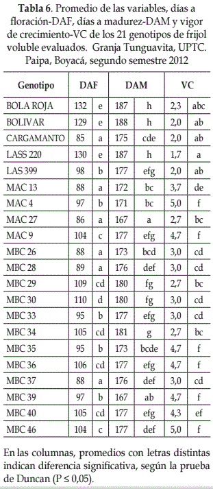 En la tabla 6 se presentan los valores obtenidos en las variables días a floración (DAF), días a madurez (DAM) y adaptación vegetativa o vigor de crecimiento (VC) para los 21 genotipos volubles evaluados.