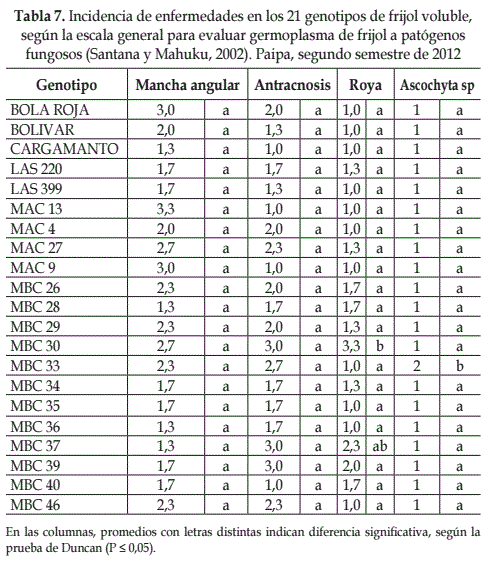 En la tabla 7, se observa los resultados correspondientes a la incidencia de enfermedades. Dichos resultados indicaron diferencias significativas solamente para roya y ascochyta, en cuanto a roya el único genotipo más afectado significativamente fue MBC30 y en ascochita el genotipo MBC33. Según la escala de calificación utilizada para evaluar la reacción de los materiales a los hongos (Tabla 2), se destaca que los valores obtenidos en general no pasaron del nivel 3, que corresponde a materiales resistentes, en los cuales los síntomas no son visibles o muy leves. Esta observación permite concluir que desde el punto de vista de resistencia a enfermedades causadas por hongos, a excepción del genotipo MBC39, todos los genotipos son deseables ya que ofrecen una resistencia a patógenos que no permite que se presente ni siquiera daño económico limitante.