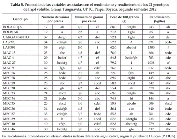 En la tabla 8 se presenta los valores correspondientes a las variables asociadas con el rendimiento y el rendimiento de los genotipos, bajo las condiciones climáticas que se presentaron en el período de experimentación.
