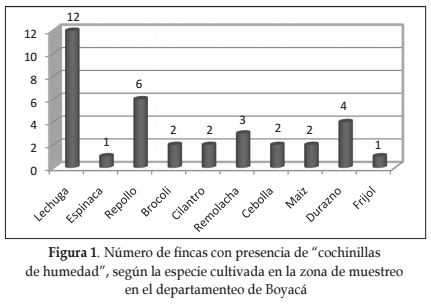Se comprobó la presencia de cochinillas de humedad en diferentes especies vegetales cultivadas; sin embargo, el mayor número de fincas con poblaciones de cochinillas de humedad fueron aquellas dedicadas a la producción de lechuga (Figura 1).