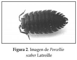 Porcellio scaber Latreille: Tegumento cubierto por tubérculos dando aspecto rugoso. Telso triangular con un ápice elongado, estrecho, agudo. Antenas cuando se extienden hacia atrás, llegan hasta el tercer pereonite. Artículos del flagelo de diferentes tamaños, siendo el primero más corto que el segundo. Maxilópodo con un endito cuadrangular, con 2 dientes prominentes en el borde superior. Urópodos con exópodos lamelares y alargados, pudiendo ser cortos (igual de largo al telso) o largo (sobrepasa el telso) (Figura 2).