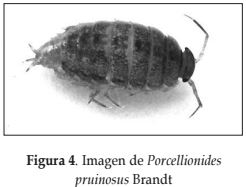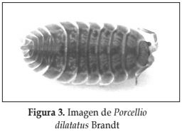 Porcellio dilatatus Brandt: Tegumento cubierto por tubérculos dando aspecto rugoso. Pigmento marrón oscuro con manchas amarillas. Telso triangular con porción distal alargada con ápice redondeado. Las antenas cuando extendidas llegan hasta el tercer pereonite con artículos del flagelo de igual tamaño (Figura 3).