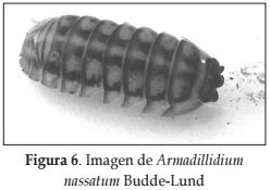 Armadillidium nassatum Budde-Lund: Capacidad volvacional, formando una pseudo-esfera. Tegumento presentando depresiones, con pigmento marrón, variando de claro a oscuro, con manchas punteadas claras. Epistoma triangular proyectado por encima dando apariencia de un lóbulo cuadrado mediano. Primer pereonite más largo que los demás, con ángulos antero laterales dirigidos hacia el frente. Telso sub-triangular con ápice redondeado. Antenas cuando extendidas no alcanzan el tercer pereonite. Flagelo con 2 artículos de igual tamaño (Figura 6).