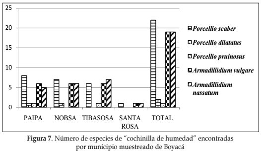 Se determinaron cinco especies de cochinilla de humedad presentes en los municipios muestreados en Boyacá: Porcellio scaber, Porcellio dilatatus, Porcellionides pruinosus, Armadillidium vulgare y Armadillidium nassatum.