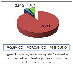 Respecto al manejo de las poblaciones de cochinilla de humedad, en las encuestas se percibió falta de conocimiento de los agricultores sobre los daños específicos ocasionados por estas y su forma apropiada de manejo, siendo utilizados insecticidas organofosforados y carbamatos, en la mayoría de los casos, aunque algunos agricultores mencionaron hacer un manejo orgánico y otros no realizar ningún manejo para estos organismos (Figura 9).