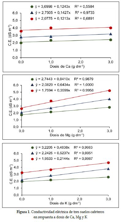 Al considerar los promedios obtenidos para cada dosis, se corrobora la menor influencia que tuvo el suministro de Ca en la salinidad de las tres localidades (Figura 1) conservando en todos los casos el siguiente orden: EE Naranjal > EE Timbío > FC Jamundí. Las pendientes de las regresiones indican además que los incrementos debidos al Ca fueron bajos y similares para los tres suelos (pendientes entre 0,1213 y 0,1427); en contraste, mediante la aplicación de Mg se registraron los mayores aumentos en todos los suelos, en especial para EE Naranjal (pendiente de la regresión=0,8410).