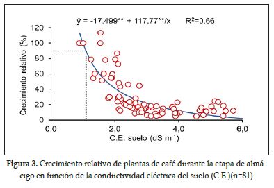 Faria et al. (2009), Figueirêdo et al. (2006) y Karasawa et al. (2003) reportan valores críticos de C.E. similares a los calculados en este estudio (1,2, 1,2 y 0,9 dS m -1, respectivamente) para el crecimiento inicial de café en algunos suelos de Brasil (principalmente latosoles). A su vez, Faria et al. (2009) observaron que la salinidad extrema resultante de la ferti irrigación con urea y KCl, causaba la muerte de las plantas. Lo expuesto difiere parcialmente de lo obtenido por Matiello (1999) para suelos con características similares, quien al aplicar agua salina a las plantas jóvenes de café mediante el sistema de goteo, observó cierta resistencia, desde que el agua no fuera excesivamente salina (hasta 2,0 dS m-1).