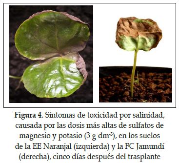La alta salinidad resultante de la aplicación de las mayores dosis de fertilizantes en especial los sulfatos de Mg y K, ocasionó la muerte de algunas plantas pocos días después del trasplante. En la unidad Chinchiná, el número de plantas muertas ascendió a 5, en Doscientos a 9 y en Timbío 13. En la Figura 4 se pueden observar las sintomatologías encontradas unos días después del trasplante.