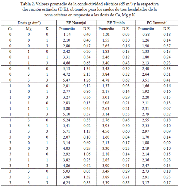 Efecto de los tratamientos en la salinidad del suelo. En el tratamiento testigo sin el aporte de Ca, Mg ni K, pero con la aplicación de DAP, la conducti-vidad eléctrica (C.E.) para los suelos de la EE Na-ranjal, EE Timbío y FC Jamundí fue de 1,5 dS m-1, 1,0 dS m-1 y 0,9 dS m-1, respectivamente. Según los rangos generales establecidos para Colombia por el ICA (1992), estos valores son relativamente bajos y se consideran normales para la zona cafetera del país, en donde las condiciones de cli-ma (principalmente la precipitación), relieve y el origen de los suelos, no favorecen la salinidad.
