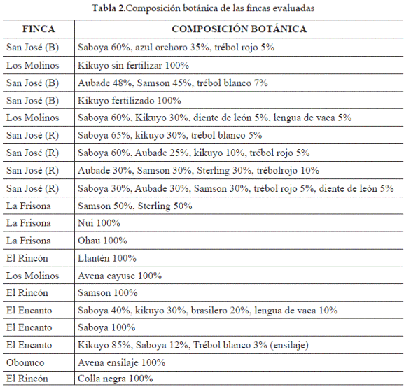 La composición botánica de cada una de las dietas de cada finca aparece en la Tabla 2.