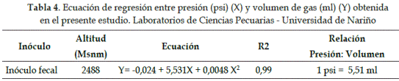 Ecuación de regresión entre presión y volumen. Con los datos de presión y volumen obtenidos en la investigación, derivados del proceso de la fermentación en los diferentes horarios de incubación, se construyó una ecuación de regresión a partir de la relación entre presión y volumen (Tabla 4), para determinar las características de presión atmosférica y condiciones ambientales del Laboratorio de Ciencias Pecuarias de la Universidad de Nariño, en la ciudad de Pasto, Colombia, para el desarrollo de la técnica in vitro de producción de gases para posteriores estudios.