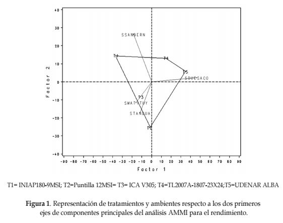 En la figura 1, se observan las líneas correspondientes a los ambientes y en los vértices del polígono, se ubican los genotipos con mayor interacción, por lo tanto de mayor adaptación específica a los ambientes representada por su cercanía a las líneas correspondientes a estos. Así, en el sector superior se ubican los ambientes de evaluación San Bernardo y Buesaco, en donde se destaca INIAP-180-9MSI como el genotipo más adaptado para San Bernardo y TL2007A80723x24 y UDENAR ALBA para la localidad de Buesaco; en la parte inferior de la gráfica, se muestran las localidades de Matituy con ICA V305 adaptado a estas condiciones y Tangua con Puntilla 2MSI, respectivamente. Por otra parte, los tratamientos más estables son los que se encuentran más cercanos al origen y en cuanto más se aleja su comportamiento se considera más variable.