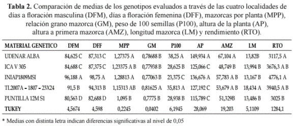 Análisis estadístico. Los resultados de las variables se sometieron a un Análisis de Varianza Combinado y Prueba de Comparación de Promedios Tukey. Para el caso de la variable de rendimiento se analizó la interacción genotipo ambiente, utilizando el modelo de efectos principales aditivos e interacción multiplicativa, AMMI (Zobel et al., 1988).