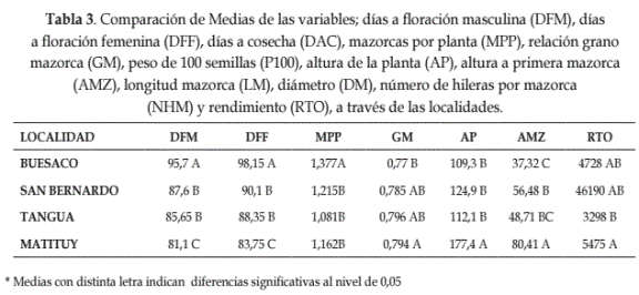 Altura de mazorca. En el ANDEVA combinado (Tabla 1), se observa que para AM, existen diferencias altamente significativas entre localidades. UDENAR ALBA, presentó un AM de 67,104 cm mostrando diferencias significativas con respecto al testigo ICA V305 (48,74 cm) y Puntilla 12MS1 (51,32 cm) (Tabla 2). Como consecuencia e igual que en AP, se puede observar que para esta variable la localidad de Matituy con 80,41 cm difiere también significativamente de las otras localidades quienes presentaron valores comprendidos entre 37,32 y 56,48 cm (Tabla 3).
