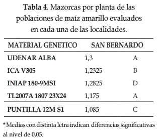 Mazorcas por planta (MPP). En la tabla 1, se observan diferencias significativas entre localidades, tratamientos e interacción genotipo por ambiente. Para MPP INIAP-180-9MSI, presentó el mayor valor con 1,28 MPP, aunque no exhibió diferencias significativas con el genotipo UDENAR ALBA (1,27MPP), ICA V305 (1,23 MPP) y TL2007A-1807-23x24 (1,15 MPP), por su parte Puntilla 12MSI (1,08 MPP) mostró diferencias significativas con los demás tratamientos (Tabla 2). En la localidad de San Bernardo, se presentaron diferencias significativas para todos los genotipos a excepción de UDENAR ALBA que presento el mayor valor con 1,3MPP y TL2007A-1807-23x24 que mostró un valor de 1,175MPP, el valor inferior fue el de Puntilla 12M S1 con 1,085 MPP (Tabla 4).