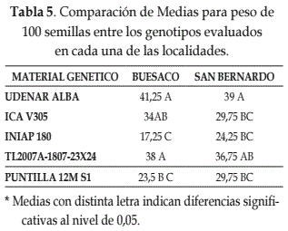 Peso de 100 semillas (P100). En p100 se encontró significancia estadística en diferencias entre tratamientos y en la interacción genotipo por ambiente (Tabla 1). UDENAR ALBA (28,25 g) superó al testigo ICA V305 (28,62 g) pero no presentó diferencias significativas con TL2007A-1807-23x24 (35,81 g) fue superior a los demás tratamientos (Tabla 2).