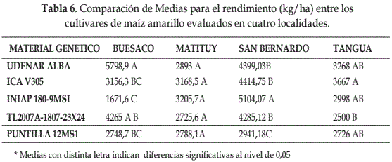 Rendimiento (RTO). Se encontraron significancias en las diferencias entre localidades, poblacionesy en la interacción genotipo por ambiente (Tabla 1). En Buesaco, el mayor rendimiento se observó en UDENAR ALBA y TL2007A-1807-23x24 con 5,79 y 4,26 t.ha-1, en su orden presentando diferencias significativas con respecto a ICA V305, INIAP 180-9MSI (1,67 t.ha-1) y Puntilla 12MS1 (3,15 t.ha-1).