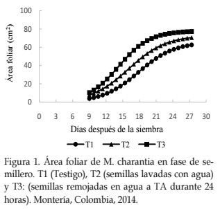La expresión cuantitativa del área foliar, materia seca de hojas y materia seca total de las plántulas de M. charantia en fase de semillero, fue mayor con el tratamiento de remojo de semillas en agua temperatura ambiente durante 24 horas.