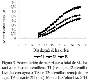 El análisis de crecimiento efectuado a través de medidas indirectas mostró mayor tasa de incremento en acumulación de materia seca por unidad de tiempo (TAC) para las plántulas del tratamiento de remojo de semillas en agua a temperatura ambiente durante 24 horas.
