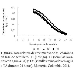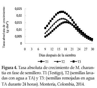 Análisis de crecimiento. La TAC, presentó la forma típica de campana o distribución normal, reportada para varias plantas hortícolas (Ardila et al., 2011). Para todos los tratamientos el crecimiento en términos de velocidad absoluta de acumulación de materia seca fue lento al inicio y fue aumentando a medida que transcurrió el tiempo, a distintas ratas de crecimiento (Figura 4). Para el caso del tratamiento tres, se encontró que la TAC presentó mayores valores durante toda la fase de semillero, con diferencias estadísticas significativas respecto a los demás tratamientos (Tabla 4), lo que implica fisiológicamente mayor capacidad fotosintética de las plantas sometidas a dicho tratamiento para producir nuevos asimilados y refleja también la eficiencia con la que es realizado el proceso (Hunt, 1982). Esto puede estar fundamentado en el hecho de que el remojo en agua favorece el crecimiento inicial, sin riesgos fisiológicos para las semillas (Harris, 2003) y es una respuesta de M. charantia a la presión ejercida por el manejo agronómico y la interacción con el ecosistema (Behera et al., 2008 y Wang et al., 2010).
