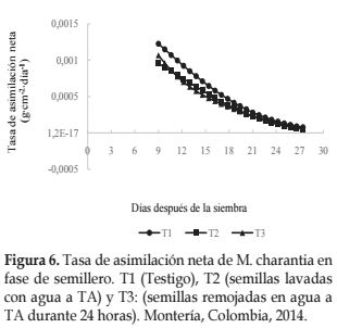 Con relación a la TAN, para todos los tratamientos, su comportamiento inicial desde un valor máximo, descendió a medida que se dio el proceso de crecimiento del cultivo en fase de semillero (Figura 6).