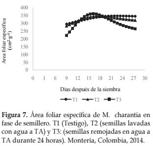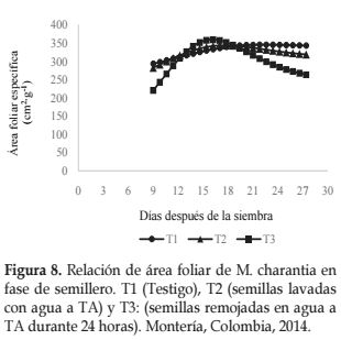 El IAF presentó mayores valores durante el ciclo de semillero para las plántulas del tratamiento de remojo de semillas con agua del grifo durante 24 horas, lo que muestra que el crecimiento fue más rápido y de mayor magnitud con respecto a los tratamientos testigo y semillas lavadas con agua.