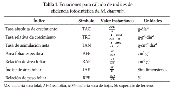 Para calcular los valores instantáneos de las medidas indirectas del crecimiento a partir de los datos de área foliar, materia seca de hojas y materia seca total, se utilizaron las ecuaciones presentadas en la tabla 1 (Gardner et al., 1990).
