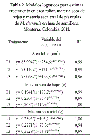 Área foliar, materia seca de hojas y materia seca total. Para estas variables se presentó un comportamiento gráfico de curva simple sigmoide (Figuras 1, 2 y 3), el cual ha sido reportado también para otras variables del crecimiento en el fruto de M. charantia como longitud, diámetro y acumulación de materia seca con el cultivar Moon Shine (Kuo et al., 2012) y en fase de semillero de Solanum melongena L. (Barraza, 2013) y se ajustaron al modelo logístico (Tabla 2).