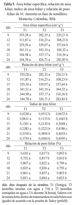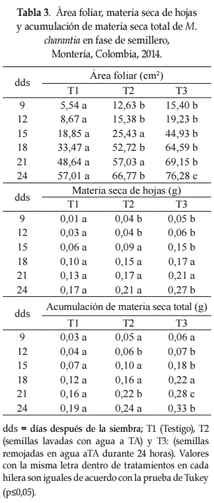 Para el tratamiento tres, las variables área foliar, materia seca de hojas y materia seca total tuvieron un comportamiento estadísticamente superior a los tratamientos uno y dos, así, para área foliar a los 15, 21 y 24 dds, para materia seca de hojas, a los 15 y 24 días despues de la siembra, y para materia seca total, a los 15, 21 y 24 dds (Tabla 3).