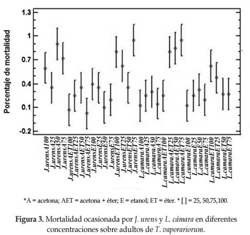 El efecto insecticida sobre adultos de T. vaporariorum registró una mortalidad superior al 80% tanto para J. urens con el extracto acetónico al 50% y para L. camara con el extracto acetónicoéterico al 25% (Figura 3), significativamente superiores a los demás extractos, valor diferente a lo obtenido por Gómez y Soto (2008) con la pringamosa (J. sp.) lográndose la mortalidad en el primer día con concentraciones superiores al 50%, diferente a la concentración del 25% donde sólo en el día ocho ocasionó la muerte al 30% de la población. Dehghani et al. (2012) registraron una disminución del 92,2 y 90,3% de los adultos de T. vaporariorum con las plantas Melia azedarach (Meliaceae) y Peganum harmala (Nitrariaceae), respectivamente.