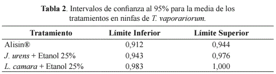 En el estado de ninfas, la Prueba de Fisher LSD indica que el tratamientos Alisin® contra el tratamiento J. urens + Etanol 25% producen mortalidad estadísticamente iguales, e inferiores a la que produce el tratamiento L. camara + Etanol 25% (Tabla 2).