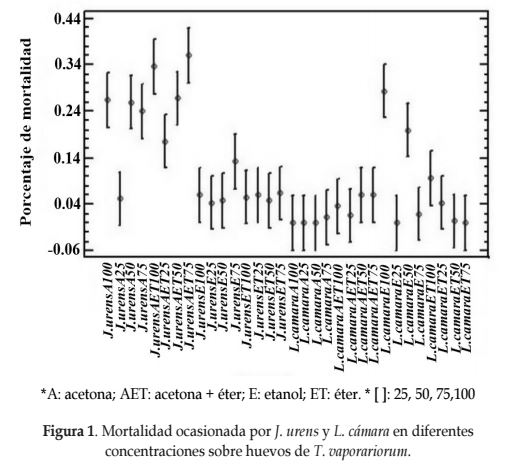 El efecto de J. urens y L. camara sobre huevos y ninfas de T. vaporariorum registro una mortalidad mayor al 80%, siendo estos extractos vegetales una alternativa de manejo importante para cultivos donde se presente reiteradamente la plaga. También, es interesante observar la capacidad de extracción de los disolventes utilizados (etanol, éter, acetona, éter-acetona) para obtener los metabolitos secundarios que causan la toxicidad en el insecto. Los extractos etanólicos y acetónicos fueron los más efectivos para obtener la DL50 en las poblaciones del insecto plaga a diferentes niveles de concentración.