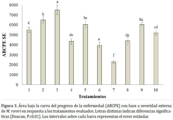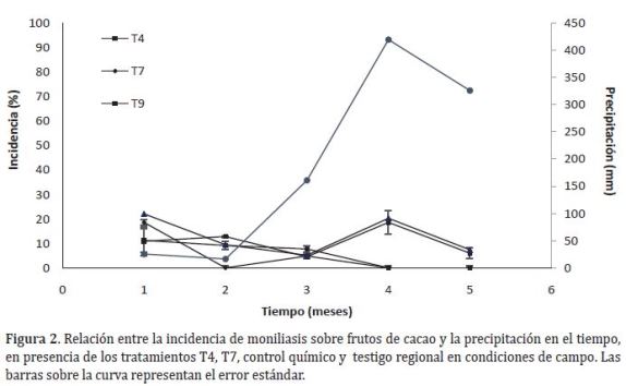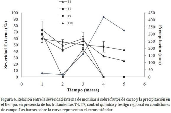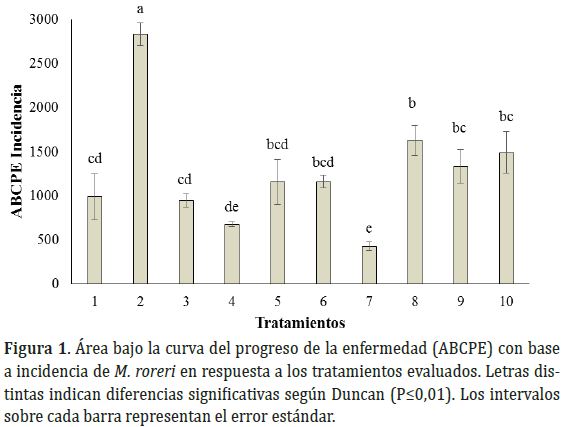 Área bajo la curva del progreso de la enfermedad (ABCPE). El ANDEVA mostró diferencias significativas entre tratamientos. Los valores del ABCPE para cada tratamiento fueron: T1: 986, T2: 2834, T3: 943, T4: 675 T5: 1157, T6: 1156, T7: 424, T8: 1629, T9: 1331 y T10: 1490. El mayor valor expresado por el T2, se debió a que las unidades experimentales de este, coincidieron con el área más sombreada del lote lo que ocasionó aumento en la humedad relativa por encima del 75%, como resultado de las altas precipitaciones y temperaturas mayores a 23°C en promedio para la zona durante los seis meses de evaluación, condiciones óptimas para el desarrollo de M. roreri (Phillips et al., 2007). En la Figura 1, los valores más bajos corresponden a los tratamientos con mayor efecto de biocontrol sobre la incidencia de moniliasis. No hubo diferencias significativas entre T7 y T4, pero si frente a los demás tratamientos y el control regional (T10). El T4, mostró diferencias en relación con los tratamientos T2, T8, T9 y T10.