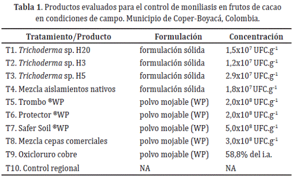 Especies antagonistas del género Trichoderma spp. tienen la capacidad de actuar contra una amplia variedad de patógenos del suelo como (Fusarium spp., Rhizoctonia spp., Pythium spp., Phytophthora spp. y Sclerotinia sp.) y del follaje (Botrytis spp. y Peronospora sp.) (Reyes et al., 2008; Rodríguez et al., 2010; Guerrero et al., 2012; Martínez et al., 2013). No obstante, la evaluación del control biológico de la moniliasis, aún se encuentra en una fase experimental (Krauss et al., 2010). Las especies de los géneros Trichoderma y Clonostachys, han sido ampliamente calificadas como agentes eficaces en el biocontrol de la enfermedad, tanto en condiciones In vitro como In situ, en diferentes áreas geográficas de Perú, Colombia, Costa rica y Ecuador (Hebbar, 2007; Bailey et al., 2008; Osorio, 2010; Krauss et al., 2010; Villamil, 2011; Villamil et al., 2012; Suárez y Rangel, 2013; Hernández et al., 2014; Villamil et al., 2015). Teniendo en cuenta lo anterior, el objetivo de esta investigación fue la evaluación del control de M. roreri tomando como parámetros incidencia y severidad de la enfermedad, al utilizar aislamientos nativos y cepas comerciales de Trichoderma spp., en combinación con prácticas culturales, debido a que los antagonistas microbianos, ejercen su control a largo plazo, integrado con diferentes prácticas agronómicas. También se contrastó la aplicación de Óxido de Cobre y el control regional, con la finalidad de incluir el componente biológico dentro del manejo integrado de M. roreri en el cultivo de cacao para la subregión occidente del departamento de Boyacá.