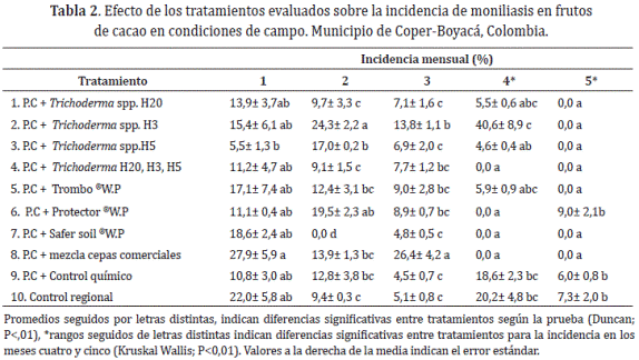 Incidencia de moniliasis en frutos de cacao. El ANDEVA indicó diferencias significativas entre tratamientos (P= 0,01) en los meses dos y tres. La prueba de Kruskal-Wallis (P= 0,01) mostró diferencias significativas entre tratamientos en los meses cuatro y cinco. En el primer mes no se presentaron diferencias entre tratamientos.