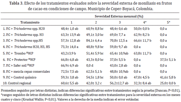 Severidad externa. Para ésta variable el ANDEVA no mostró diferencias significativas entre tratamientos en los meses uno y tres; contrario ocurrió en el mes dos (P= 0,01). La prueba Kruskal-Wallis (P= 0,01) presento diferencias significativas entre rangos de los tratamientos en los meses cuatro y cinco (Tabla 3).