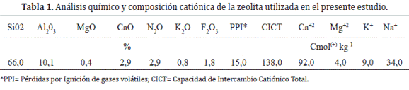 Este experimento se llevó a cabo en las instalaciones del Instituto de Suelos de La Habana Cuba ubicado en las coordenadas 23° 7`LN y 82° 23`LO, a una altura de 5msnm. La temperatura y precipitación promedio anual es de 25,2°C y 1189mm al año respectivamente. Los suelos utilizados pertenecen al orden taxonómico typic andoaquept caracterizados por sus colores grisáceos con drenaje interno deficiente. Se realizó un muestreo de suelos aleatoria de la parcela correspondiente a este tipo de suelo para minimizar la heterogeneidad siguiendo los lineamientos de Osorio y Casamitjana (2011). La zeolita utilizada, provino del yacimiento de Tasajera compuesta por 85% de clinoptilonita y heulantita, 10% de modernita y el 5% restante de otros minerales. El análisis mineralógico con difracción de Rayos X y la determinación de su composición química, se realizó con la colaboración del Centro de Investigaciones y Proyectos para la Industria Minero-Metalúrgica (CIPIMM) (Tabla 1). Esta zeolita es de tipo cálcico - sódica con alta capacidad de intercambio catiónico y bajo contenido alumínico.