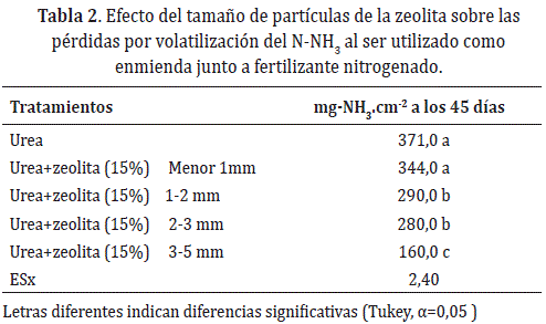 Efecto del tamaño de partícula de zeolita en la volatilización del nitrógeno. La aplicación de zeolita con tamaño de partícula mayor a 1mm redujo significativamente la volatilización del nitrógeno a los 45 días después de la aplicación de la urea (Tabla 2). La reducción de emisiones de nitrógeno en formas amoniacales en los tratamientos con zeolita estuvo entre 7,3% y 56,9% con respecto a la aplicación de la urea sin enmienda. A mayor tamaño de partícula, la reducción de la volatilización del nitrógeno fue menor, siendo las partículas entre 3 - 5 mm significativamente más efectivas que aquellas menores a 3 mm. El mayor tamaño de partícula redujo la volatilización en 53,5, 44,8 y 42,9% con respecto a los tamaños < 1mm, 1-2 mm y 2-3 mm. Similares resultados fueron hallados por Urquiaga y Zapata (2002) quienes reportaron reducción del orden de 46,6 y 47,8% en la volatilización del nitrógeno al usar urea más 15% de zeolita en suelos vertisoles pélicos y Grey nodulares, respectivamente. El mayor tamaño de partícula obtuvo el mejor comportamiento debido posiblemente a la similitud granulométrica entre la zeolita y el fertilizante utilizado, que garantizó mayor y mejor contacto entre partículas, favoreciendo la adsorción de amonio (Tarkalson, 2010; Malekian et al., 2011).