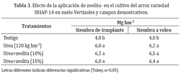 Efecto de zeolita en la volatilización del nitrógeno y producción de masa seca en arroz Oryza sativa. En las pruebas de campo donde se establecieron parcelas de arroz con aplicación de zeolita, no se hallaron diferencias significativas en el rendimiento en comparación con la aplicación de la urea sola, pero si fueron halladas en comparación con el testigo (Tabla 3). La aplicación de 120 kg hm-2 de Urea +Zeolita aumento la adsorción del NH4+ en el suelo y logró retenerlo durante la etapa de máxima adsorción del arroz, favoreciendo el uso del nitrógeno (Tarkalson, 2010). El incremento del rendimiento en los tratamientos con zeolita, estuvo alrededor del 35% con respecto al testigo en los lotes donde se sembró el arroz por trasplante. Los rendimientos obtenidos en el sistema de siembra al voleo, fueron mayores alcanzando valores hasta de 6,5 Mg hm-2 debido posiblemente, a que, con este método de siembra, se puede alcanzar mayor densidad de plantas. Nuevamente los tratamientos con zeolita estuvieron por encima de la urea y el testigo alcanzando incrementos del 5 y 38% respectivamente. Similares resultados fueron reportados por Sepaskhah y Barzegar (2010) quienes alcanzaron incrementos de hasta 28 y 62% al utilizar 4 Mg hm-2 de zeolita y dosis de fertilizante nitrogenado de 80 kg hm-2con respecto a la aplicación de urea sin zeolita y el testigo absoluto respectivamente.