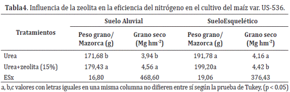 Efecto de la zeolita en el rendimiento de maíz Zea mays cultivado en dos tipos de suelos. En el suelo aluvial, la aplicación de zeolita incrementó significativamente el peso de grano por mazorca y el peso seco de grano de maíz en 4,3 y 13,6%, en su orden (Tabla 4). En el suelo esquelético, los rendimientos de grano alcanzados fueron mayores que en el suelo aluvial y estuvieron del orden de 4,42 kg hm-2 con urea + zeolita y 4,16 kg hm-2con la urea sola. Al igual que en el cultivo del arroz, la eficiencia en el uso del nitrógeno al igual que el acondicionamiento del medio edáfico pudieron ser las causas para obtener estos resultados.