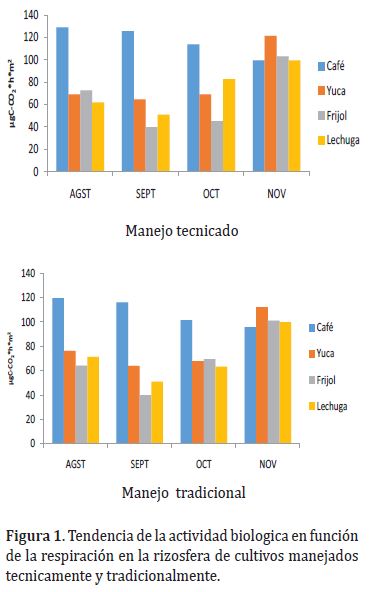 Para el muestreo de septiembre (Figura 1) se observa que la respiración de los cuatro cultivos en los dos manejos, registraron menores promedios comparados con el muestreo anterior, oscilando entre 116,0 y 125,6 μg(C-CO2) hm2 para café tradicional y tecnificado respectivamente, 64,0 y 64,4 μg(C-CO2)hm2 para yuca, 39,6 y 40,0 μg(C-CO2)hm2 para frijol y 50,8 y 51,0 μg C-CO2hm2 para la lechuga. De acuerdo con la prueba de promedios, las parcelas con café y yuca, presentaron los mayores promedios. La disminución en el caso de fríjol y lechuga en éste muestreo, se debió posiblemente a que la cobertura vegetal disminuyó el área de exposición al sol, controlando procesos de mineralización y en consecuencia la actividad biológica del suelo (Gómez et al., 2000).