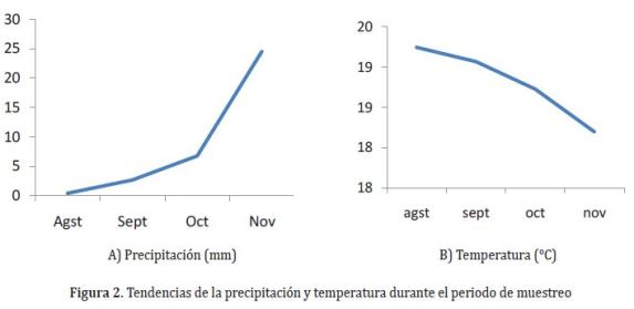 Este ascenso presentado por yuca, fríjol y lechuga entre octubre y noviembre estuvo relacionado con el aumento de la precipitación y la disminución de la temperatura. Aquí cabe anotar que durante los meses mencionados la precipitación (Figura 2a) se incrementó mes a mes de 0,4 a 2,7 mm/día en septiembre, a 6,8 mm/día en octubre y a 24,6 mm/día en noviembre, donde alcanzó la máxima registrada. En cuanto a la temperatura (Figura 2b), ésta presentó un decrecimiento mensual a partir de agosto.