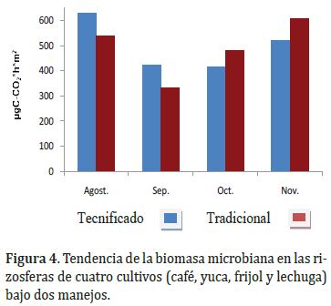 Al comparar la tendencia de esta variable con la biomasa microbiana de los cuatro cultivos promediada también por manejo durante los cuatro muestreos, se observa un comportamiento similar, lo que permite inferir que la liberación de CO2 se debió tanto a la actividad de la raíz como a la actividad microbiana (Figura 4).