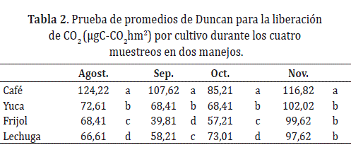 Liberación de CO2 por respiración en los diferentes cultivos. En la Figura 1, se observa la tendencia de la actividad biológica en función de la liberación de CO2 proveniente de la respiración en todos los cultivos (café, yuca, fríjol, lechuga) muestreados entre agosto y noviembre de 2014, oscilando entre 40 y 126 μgC-CO2*h*m2. El Análisis de Varianza (α = 0,05) presentado en la Tabla 1, muestra que existen diferencias significativas entre los promedios de respiración presentados por el factor cultivo en los cuatro muestreos, en contraste no se observan diferencias por el factor manejo Sin embargo, la tendencia presentada por el cultivo de café, es contraria a la presentada por los cultivos de yuca, fríjol y lechuga. De la prueba de promedios según el factor manejo (Tabla 2), se puede deducir que la mayor liberación de CO2 a partir de la rizósfera, se registró en el cultivo de café durante los tres primeros muestreos, tanto en plantas manejadas técnicamente como en aquellas manejadas tradicionalmente. Los resultados de los otros cultivos fueron más heterogéneos, comportamiento que amerita el análisis por muestreo.