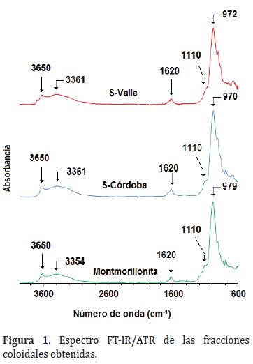 La similitud de los perfiles de los espectro de absorción de las muestras en relación al de la montmorillonita, indican que la composición principal de las fracciones coloidales obtenidas son de origen mineral para ambos suelos (Madejová et al., 2010).